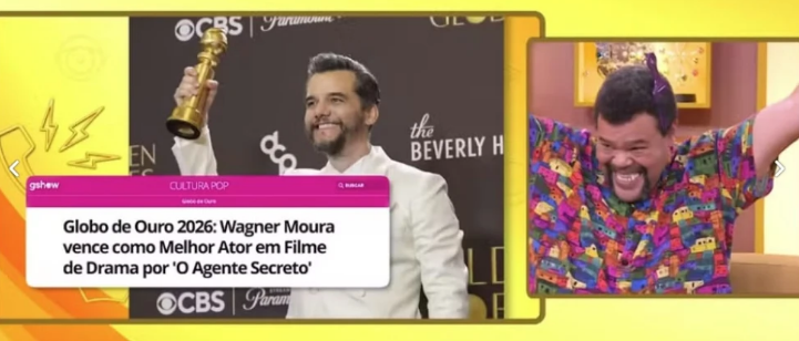 “Incrível! Ele estava incrível nesse filme. É impressionante”, comemorou Babu. A dupla de apresentadores contou também que “O Agente Secreto” vai concorrer em quatro categorias no Oscar, que acontece neste domingo (15).
