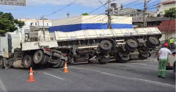 Antes do destombamento, equipes realizam o transbordo da carga para outro veículo, etapa necessária para a retirada da carreta da pista. A Polícia Militar (PM) e a BHTrans estiveram no local durante a ocorrência.