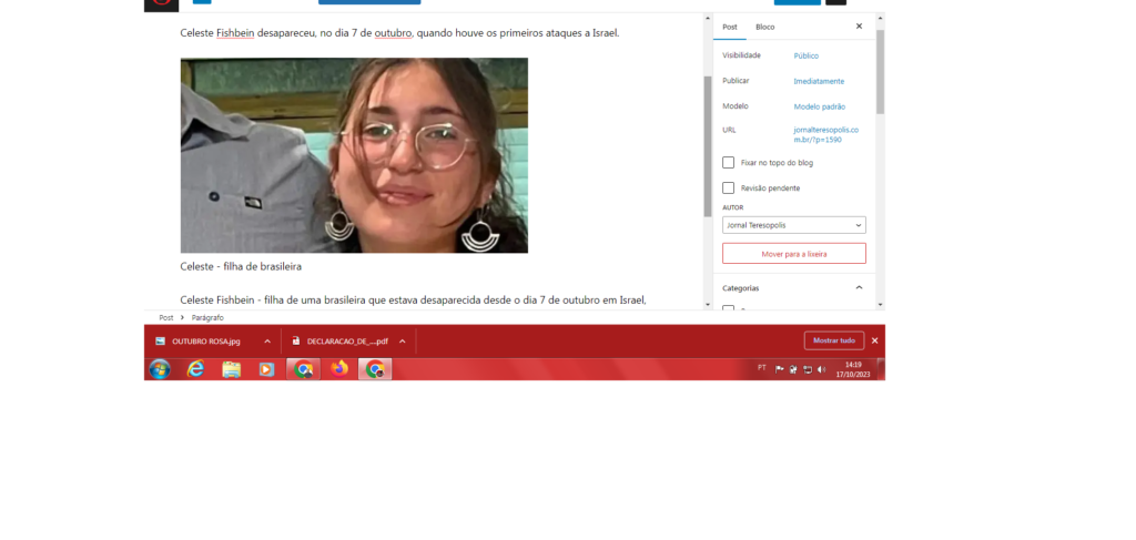 Celeste Fishbein desapareceu, no dia 7 de outubro, quando houve os primeiros ataques a Israel. Celeste Fishbein – filha de uma brasileira que estava desaparecida desde o dia 7 de outubro em Israel, após os ataques do Hamas, teve a morte confirmada pela família. O tio de Celeste, Mario, disse que representantes do exército israelense […]